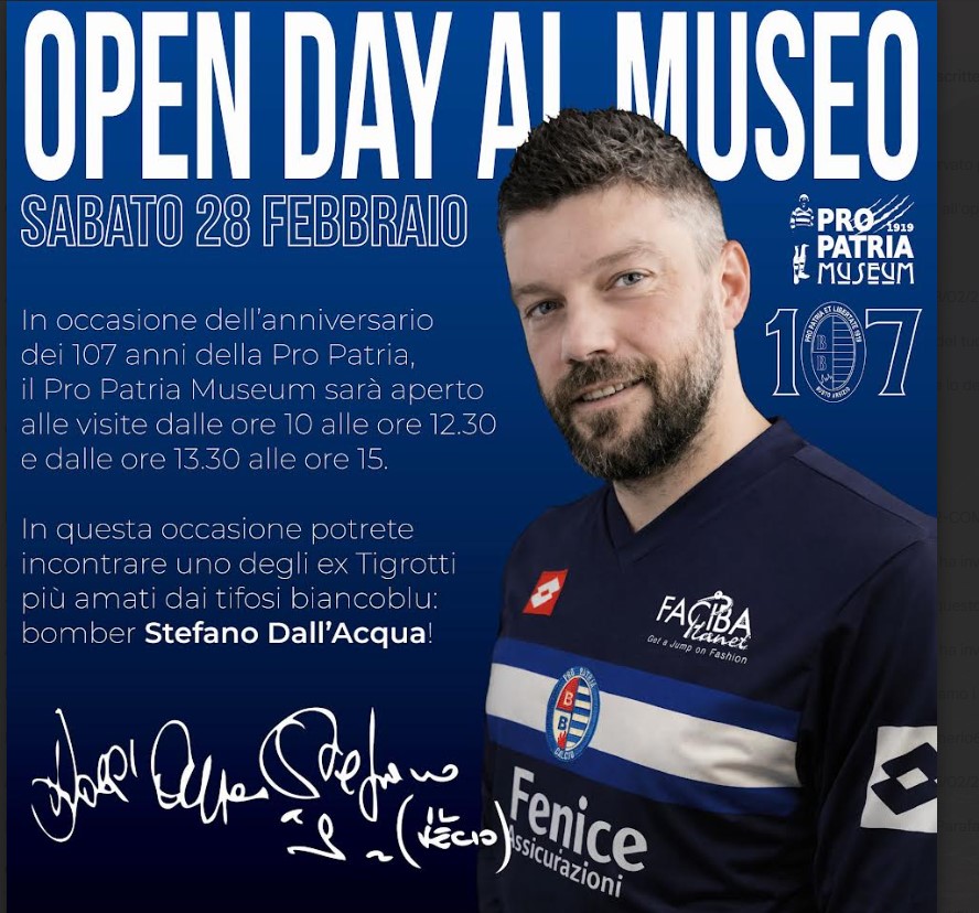 Oggi, siete invitati all’open day del Pro Patria Museum. In occasione dell’anniversario dei 107 anni della Pro Patria, il museo sarà aperto alle visite con i seguenti orari: dalle ore 10 alle ore 12.30 dalle ore 13.30 alle ore 15 In questa occasione potrete incontrare due dei Tigrotti più amati dai tifosi biancoblu: Paolo Tramezzani e Stefano […]
