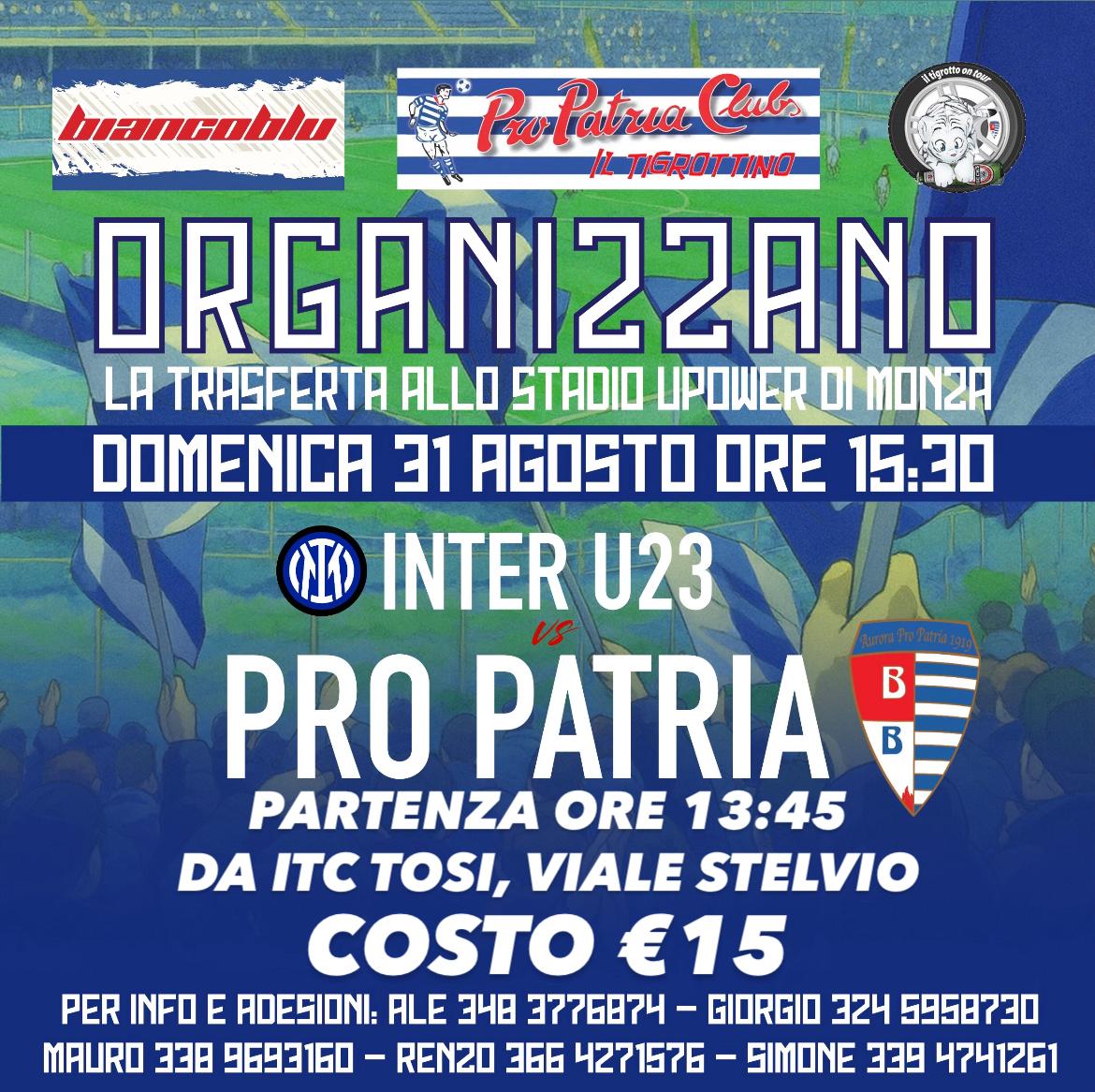 Il Pro Patria Club con il Tigrotto e Biancoblu, organizza la trasferta di Monza in occasione della partita Inter U 23-Pro Patria, che si svolgerà in data 31 Agosto, alle ore 15,30.